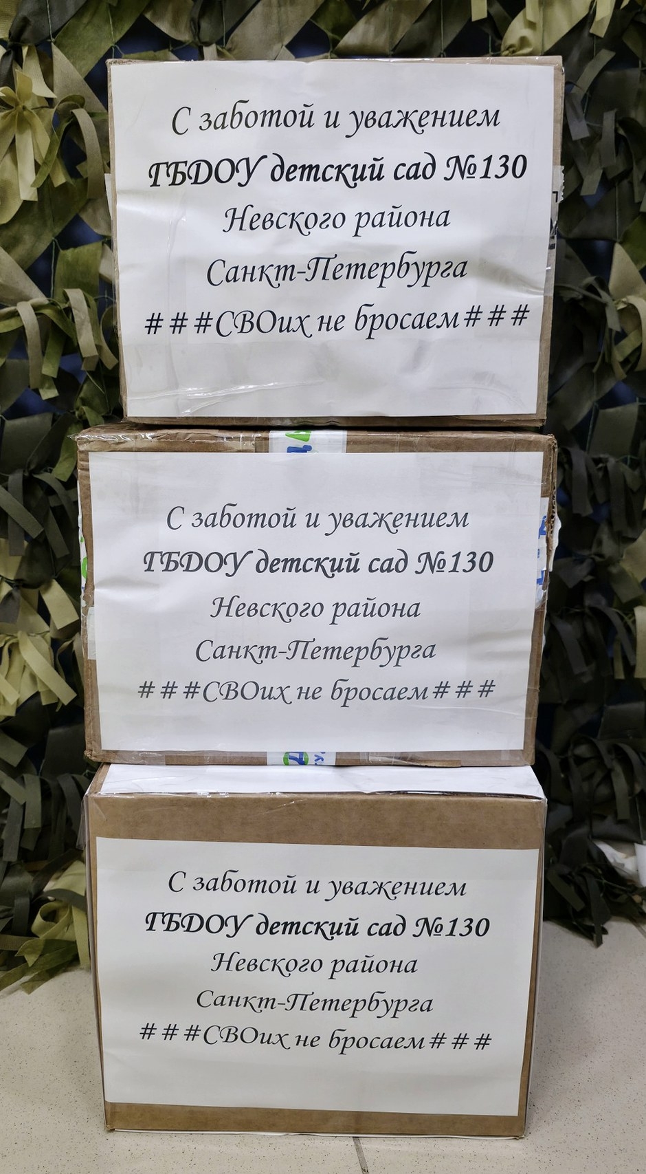 Сердечно благодарим руководство, коллектив и родителей воспитанников из Детский сад №130 Невского района Санкт-Петербурга за замечательную посылку с разнообразным содержимым, отправленную в адрес военнослужащих армии России, задействованных в Специальной Военной Операции.