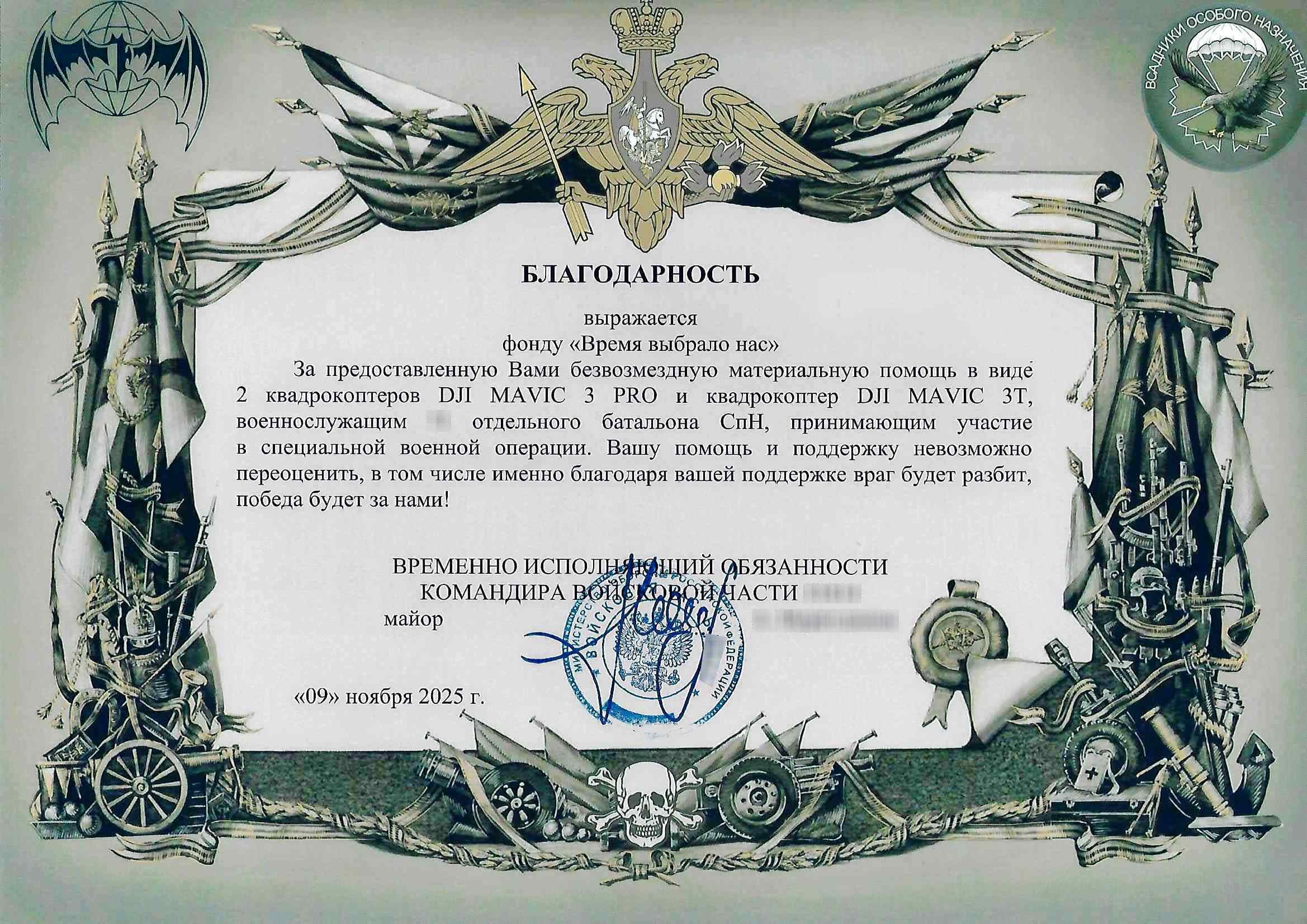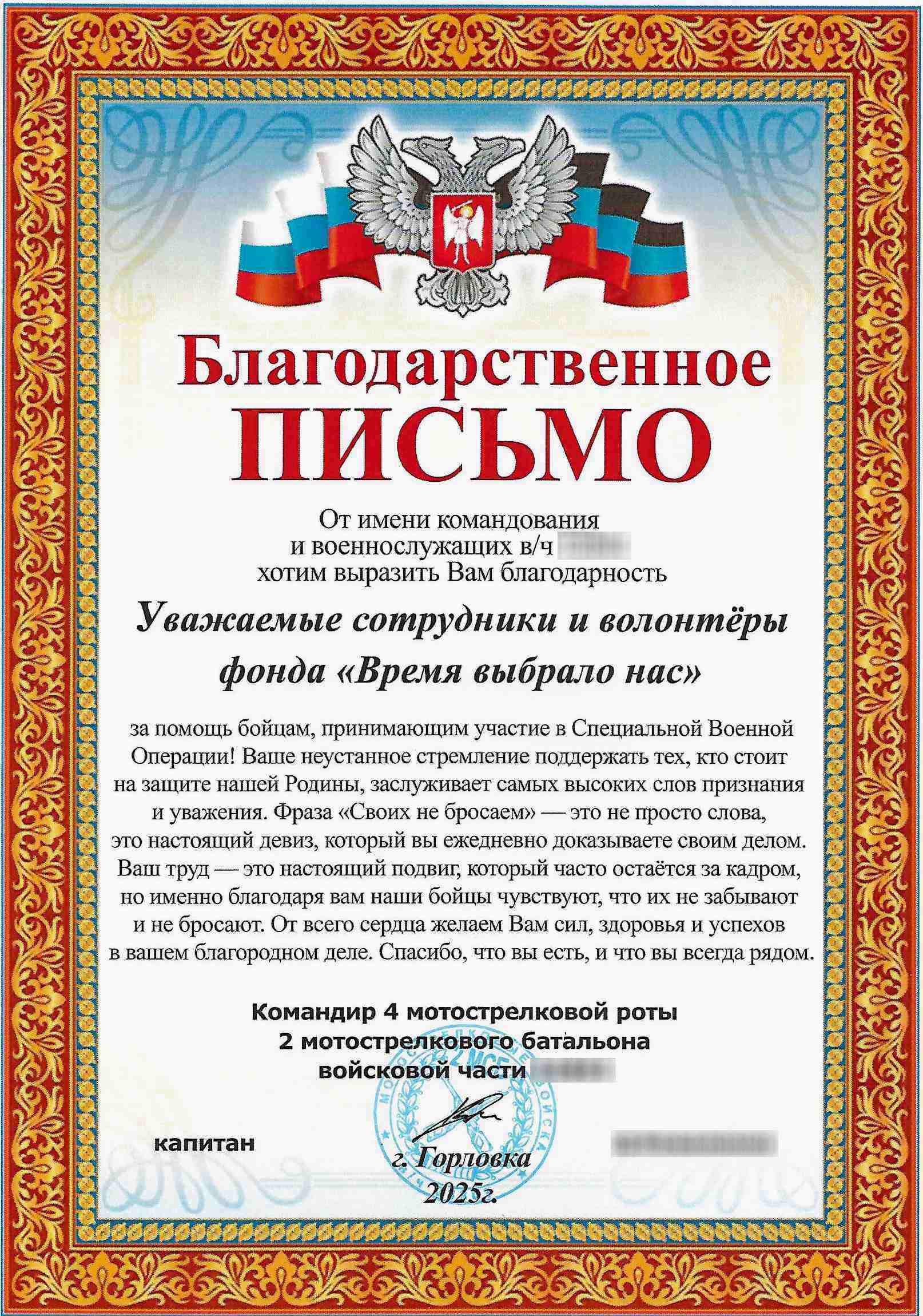 Друзья! Давненько мы не выкладывали благодарственные письма, полученные нами от командования и бойцов воюющих подразделений. Будем исправляться, тем более что за прошедшее время их у нас накопилось очень много. Все они в итоге займут своё достойное место в нашем ленинградском штабе на Проспекте Стачек, дом 75.