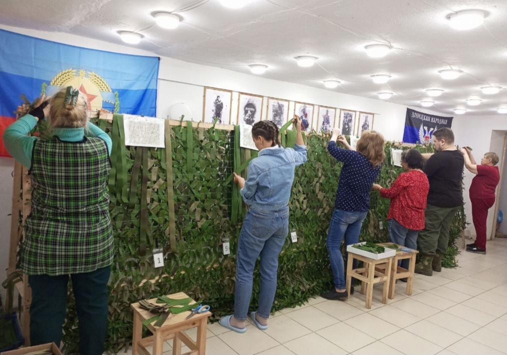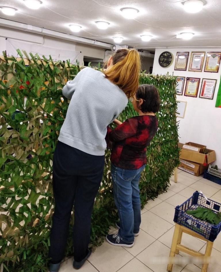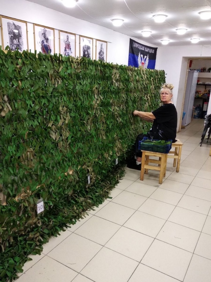 По завершению дня движуха в штабе всё равно продолжалась. Наш товарищ с позывным "Стрекоза" осталась работать над маскировочной сетью, которая совсем скоро вместе с партией таких же средств камуфляжа отправится на фронт.
