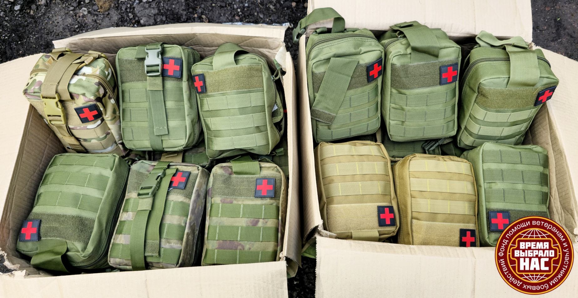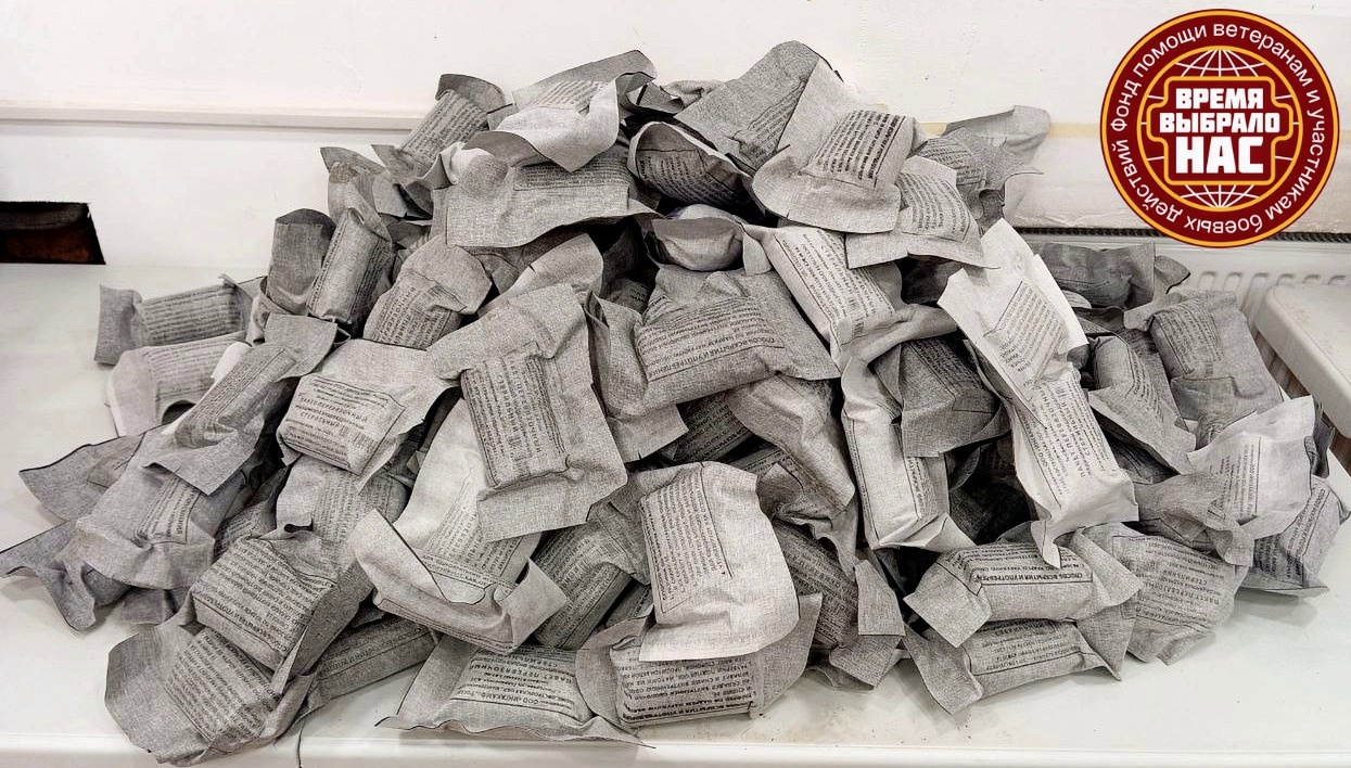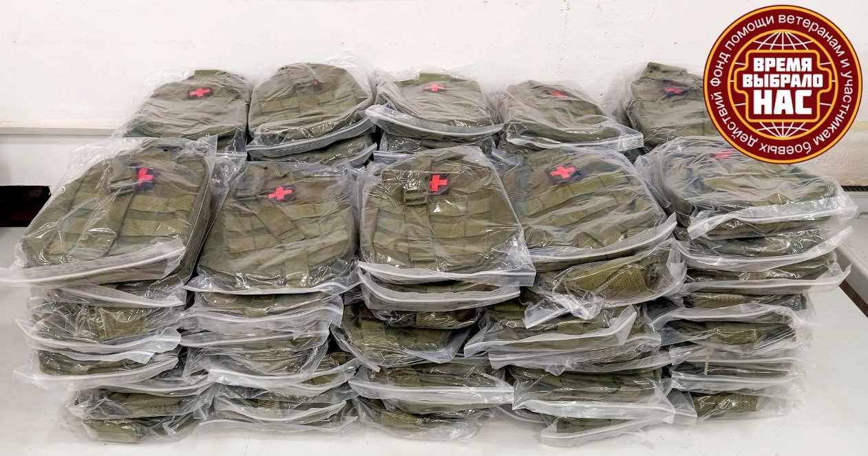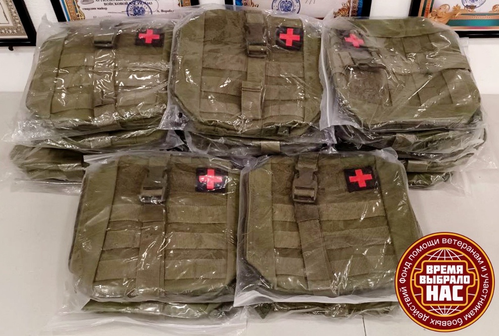 На фотографиях очередные партии «нужностей» – отрывные аптечные подсумки и индивидуальные перевязочные пакеты (ИПП).