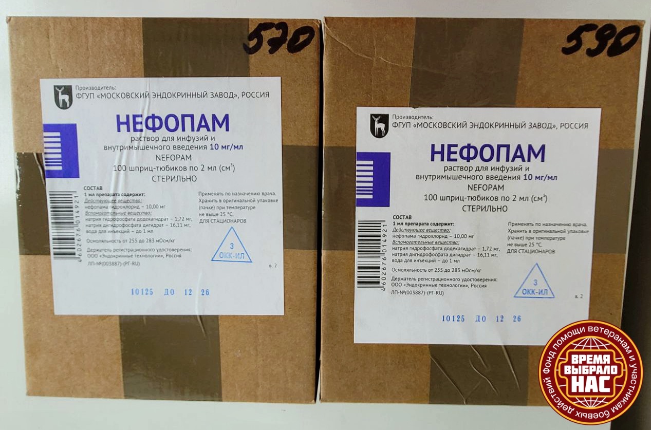 Благодаря пожертвованиям участников группы ДОНБАСС☆ПОМОЩЬ☆2015 были закуплены 2 коробки обезболивающего «Нефопам» (200 шприцев-тюбиков). Общая стоимость составила 51 800 руб. Данное медсредство мы использовали при комплектации аптечек, предназначенных для штурмовых отрядов.