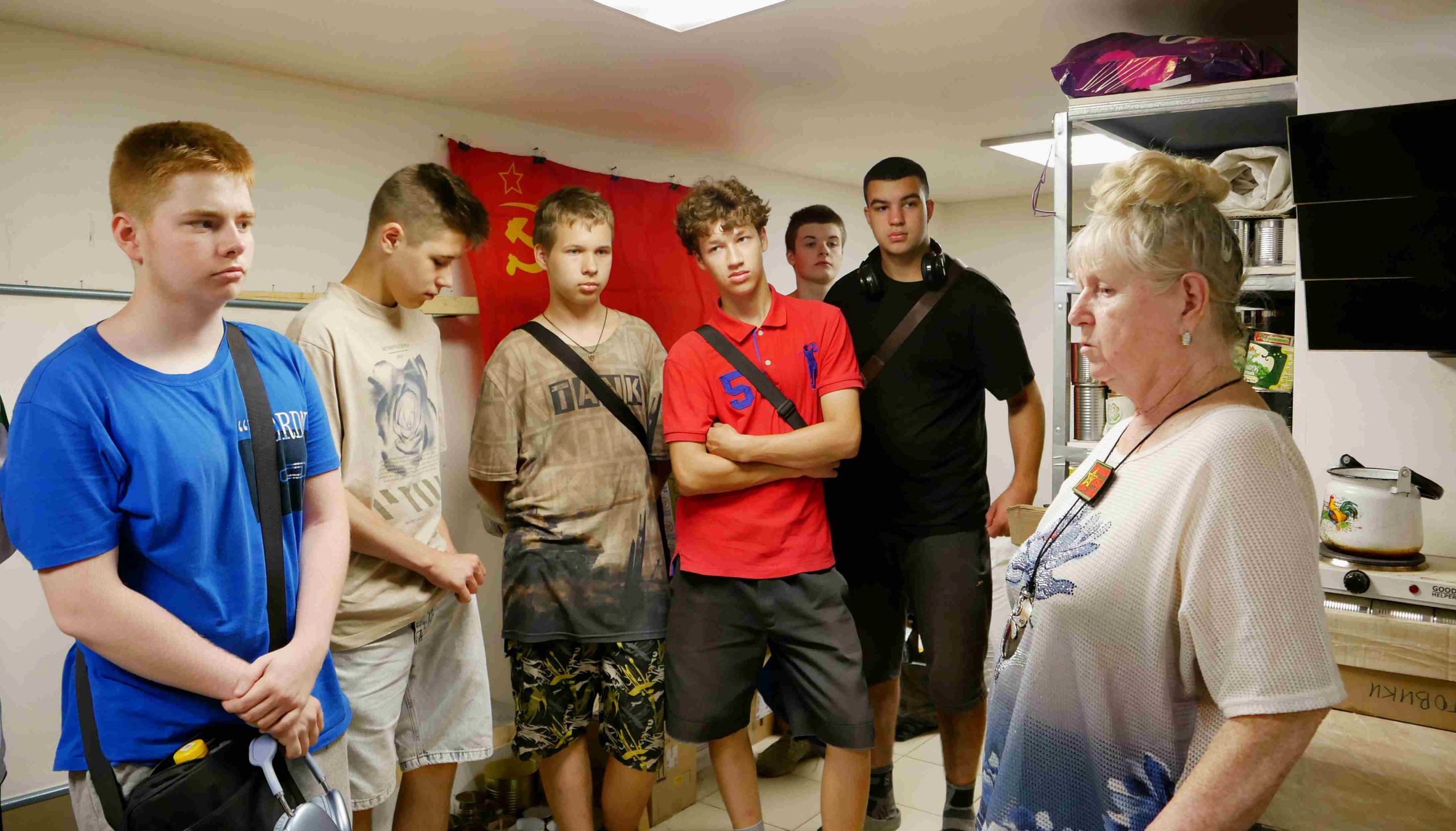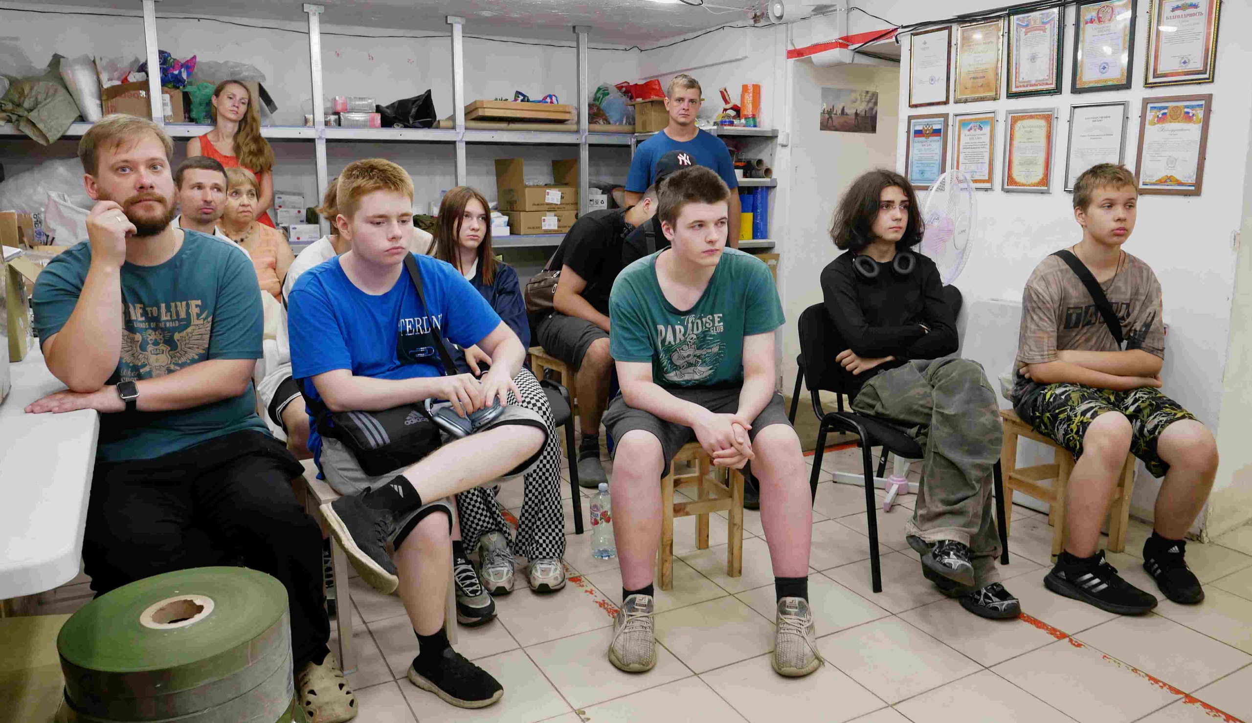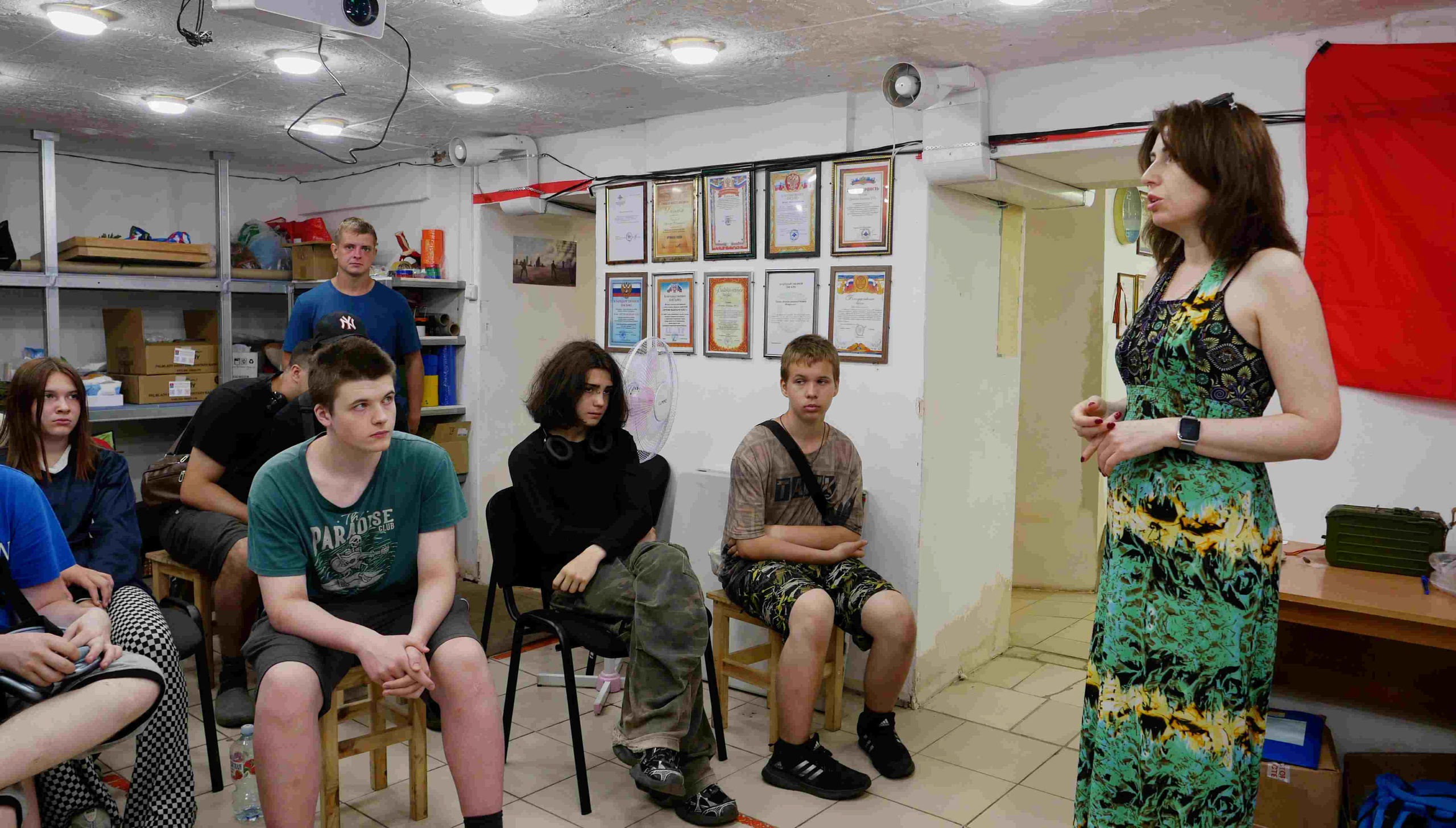 Также для ребят была организована экскурсия по штабу, в ходе которой одна из активных членов команды Боевых Плетунов Ленинграда с позывным «Стрекоза» рассказала им о процессе плетения маскировочных сетей и изготовления окопных свечей.