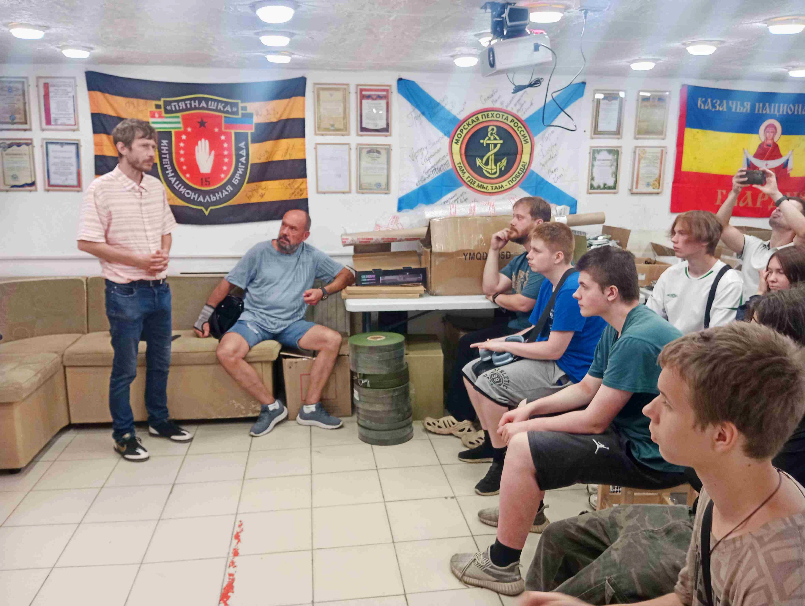 Моя встреча с участниками слёта началась со знакомства и краткого рассказа о более чем 10-летнем боевом пути группы ДОНБАСС☆ПОМОЩЬ☆2015 и о работе фонда «Время выбрало нас». Затем мы все вместе посмотрели наш фильм «Руками и ногами человеческими». А после просмотра я ответил на вопросы ребят.