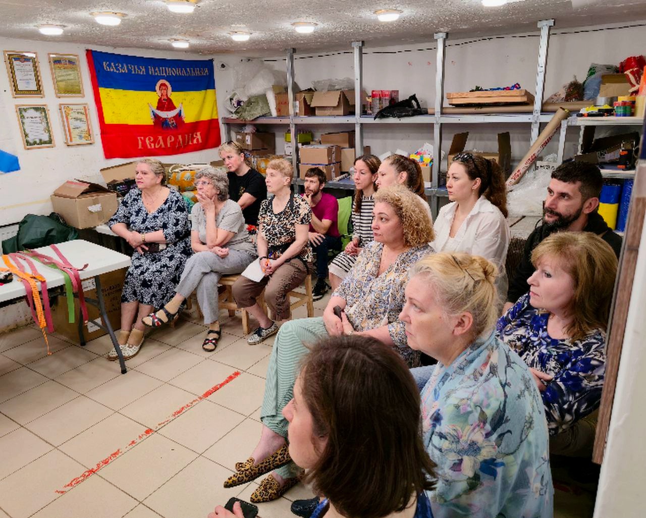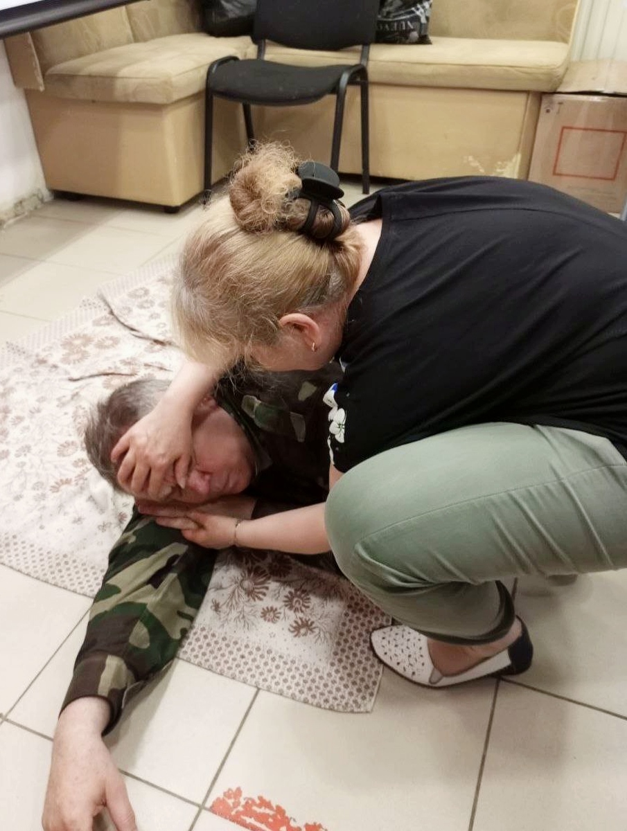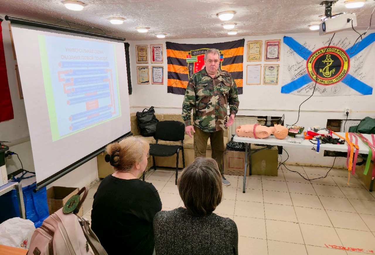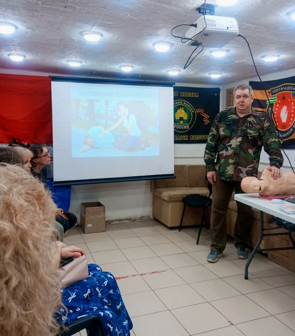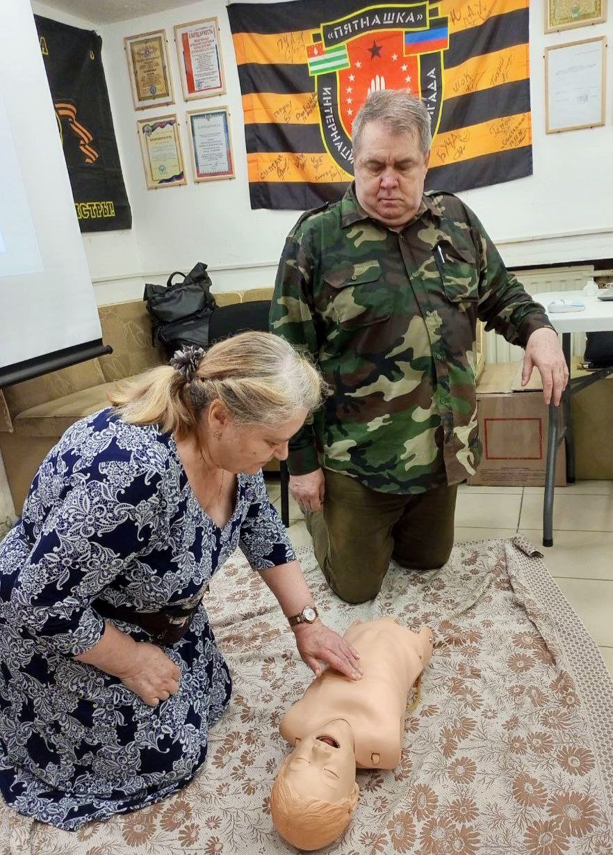 Четыре часа пролетели незаметно! Сергей Анатольевич очень интересно и «по живому» рассказывал о том, как надо правильно реагировать на различные внештатные ситуации, а также демонстрировал всё это и на «подопытном» манекене, и на себе! С ним мы разобрали массу возможных случаев – от того, что кому-то на наших глазах стало плохо и до получения ранения в случае атаки беспилотника противника, что в наши неспокойные времена становится уже вполне вероятным! И конечно же не обошлось без практики! Все желающие самостоятельно переворачивали на бок «пострадавшего», накладывали жгут, делали искусственное дыхание и проводили другие необходимые манипуляции.