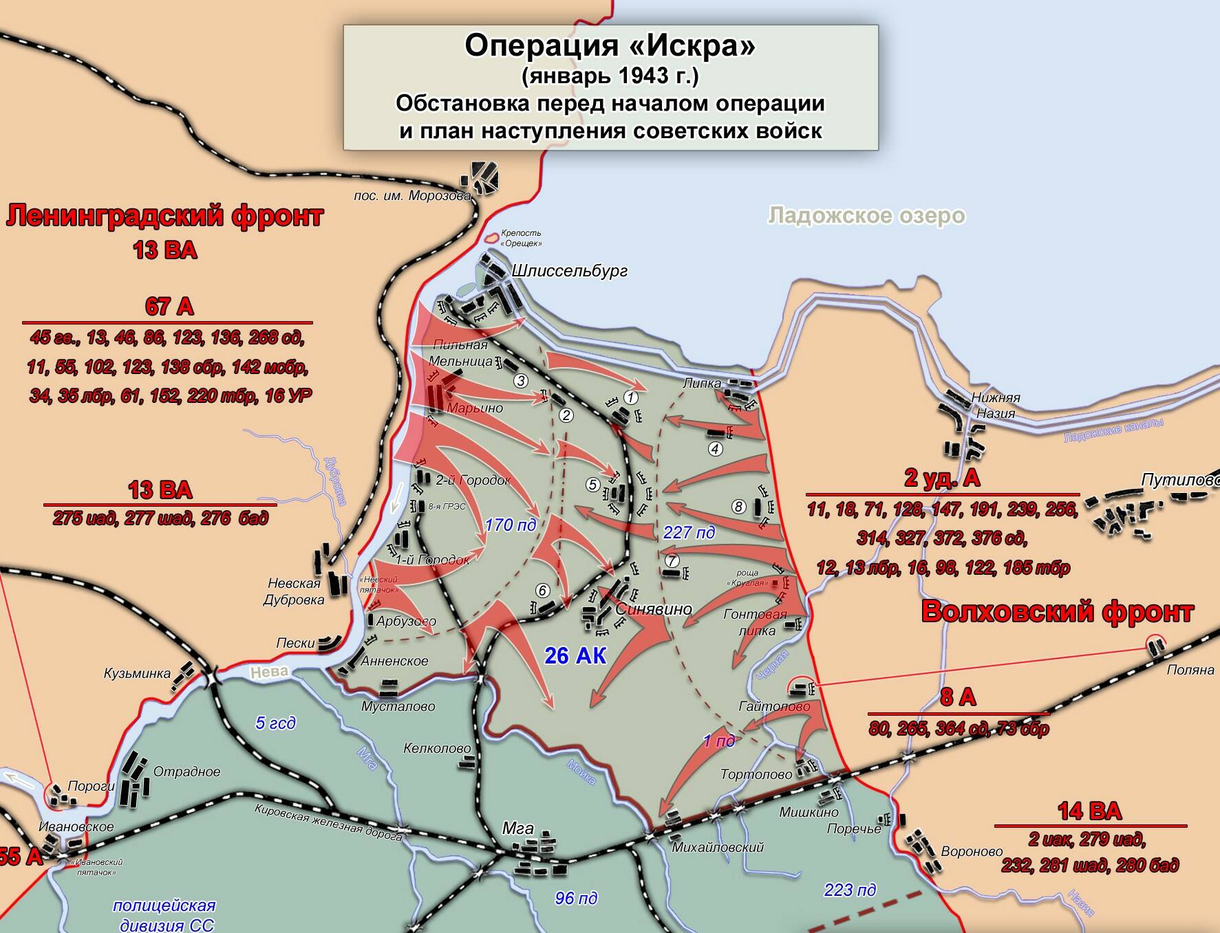 18 ноября 1942 года командование Ленинградского фронта представило Верховному Главнокомандующему свои предложения по подготовке нового наступления под Ленинградом. В ходе «Шлиссельбургской операции» в декабре 1942 года планировалось совместно с Волховским фронтом «снять блокаду с Ленинграда» и «обеспечить постройку железной дороги вдоль Ладожского канала», а в ходе «Урицкой операции» в феврале 1943 года — восстановить сухопутную связь с Ораниенбаумским плацдармом. Ставка ВГК, рассмотрев это предложение, потребовала сосредоточить все внимание на прорыве вражеской обороны только на одном направлении — шлиссельбургском, которое кратчайшим путем приводило к достижению поставленной цели. План «Шлиссельбургской операции» был утверждён директивой № 170696 от 2 декабря 1942 года. В конце 1942 года И. В. Сталин предложил название операции — «Искра», объяснив это тем, что все попытки прорвать блокаду закончились неудачей, а теперь из этой искры должно возгореться «пламя». Операции была назначена дата готовности к 1 января 1943 года.