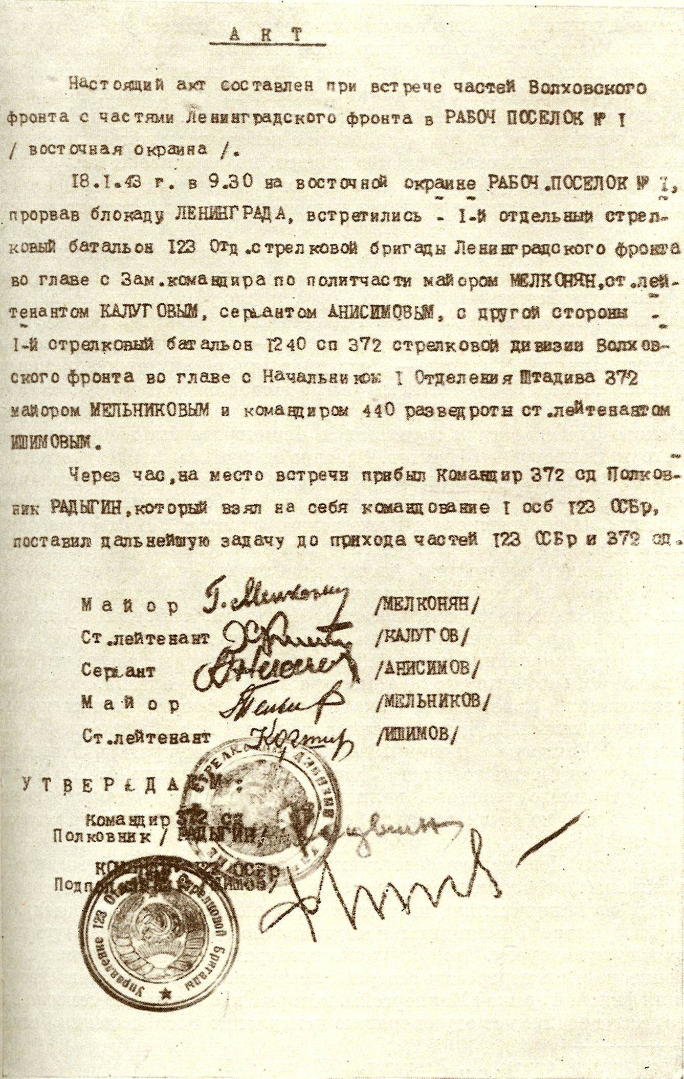 К 18 января войска Ленинградского и Волховского фронтов разделяли всего несколько километров. В районе Рабочих поселков № 5 и № 1 держала оборону немецкая «группа Хюнера», которой была поставлена задача до последней возможности удерживать позиции, а войскам попавшим в окружении в районе Шлиссельбурга и Липки была дана команда пробиваться на юг. Первый номинальный прорыв блокады состоялся 18 января 1943 в 9:30 утра, когда первый отдельный стрелковый батальон 123-й отдельной стрелковой бригады 67-й армии Ленинградского фронта во главе с заместителем командира по политической части майором Мелконяном, старшим лейтенантом Калуговым, сержантом Анисимовым встретились с частями 372-й дивизии 2-й ударной армии Волховского фронта во главе с майором Мельниковым и командиром 440 разведроты старшим лейтенантом Ишимовым на восточной окраине Рабочего посёлка № 1. В 10:30 к ним присоединился командир 372-й стрелковой дивизии полковник Радыгин, взявший на себя дальнейшее командование.